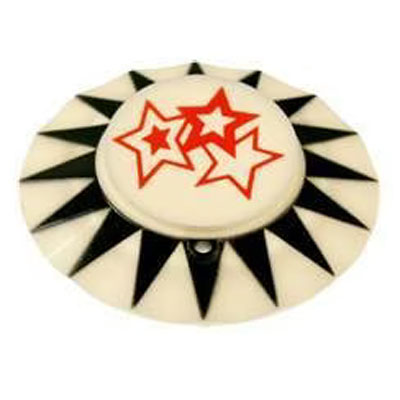White pop bumper cap with black starburst design around the edge and 3 stars logo in center in red printing, hot-stamped. For lower pop bumper on Dolly Parton pinball.