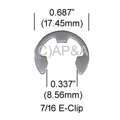 7/16-inch e-clip. Steel, black phosphate coating. 0.035-inch thick.
