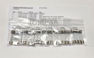 Fuse assortment kit with 4 each of the common fuses for Gottlieb electronic solid-state (SS) games made from approx. 1977-1995 (see game listing below).