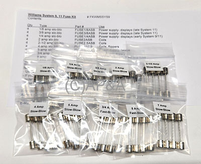 Fuse assortment kit with 4 each of the common fuses for Williams System 9 and 11 games made from 1985 through 1990 (see game listing below).