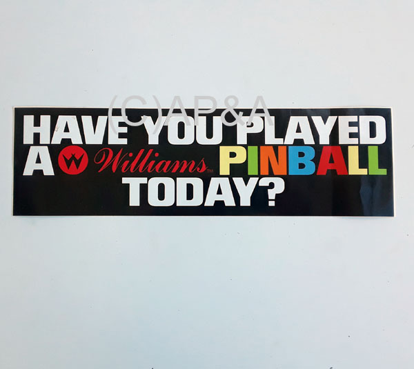 Car bumper sticker for Williams pinball. Measures approx. 12 x 3.5 inches, self-adhesive.