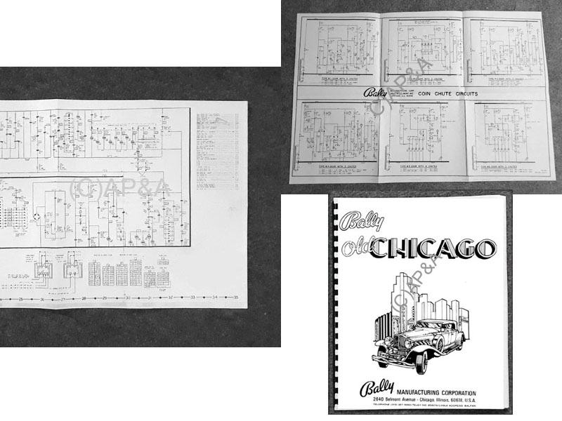 Buy together and save! 3-piece set of game manual and fold-out schematic wiring diagrams for Bally Old Chicago pinball.