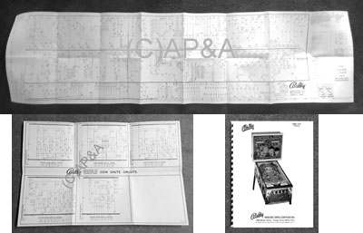 Wiring diagrams include large fold-out main schematic diagram, and separate coin chute circuits diagram. Features diagrams of all circuits with listings of relays/coils/solenoids and part numbers. Reprint diagrams in new condition.