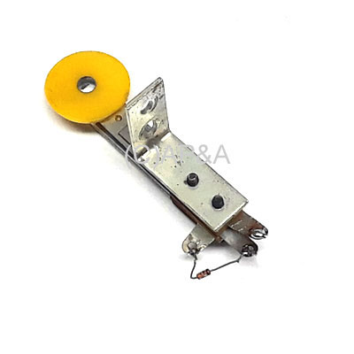 Used yellow standup target switch assembly with reversible mounting bracket from vintage Bally electronic solid-state (SS) pinball.