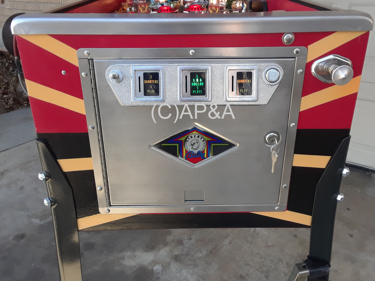 | Cabinet front. Coin door fully disassembled, cleaned, rebuilt. New lock and SBA dollar decal installed.