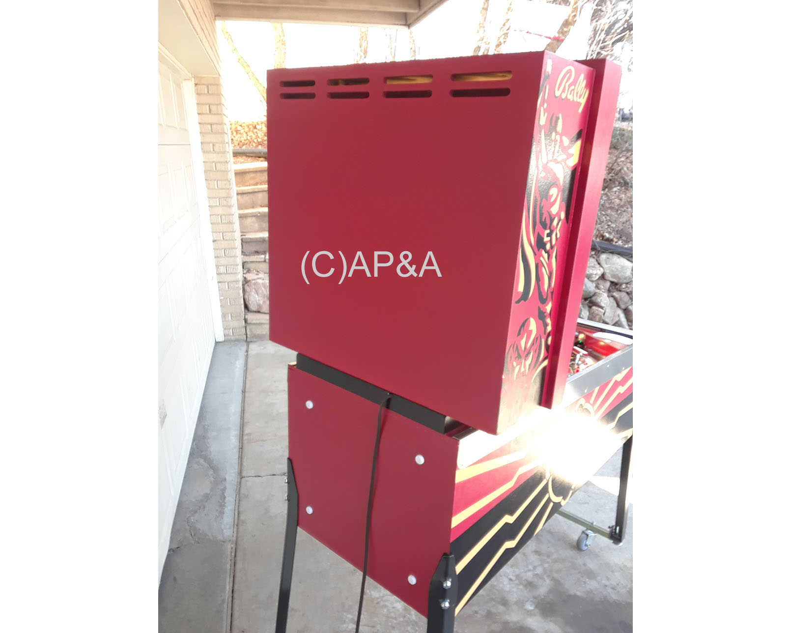 | We've made and installed 2 custom aluminum protector brackets at either side of the top edge of the playfield. These protect the wood and plastics at these points against damage from the factory metal brackets in the main cabinet that rub on the back edge of the playfield when it is raised and lowered. No need to worry about any wear/tear or damage here.