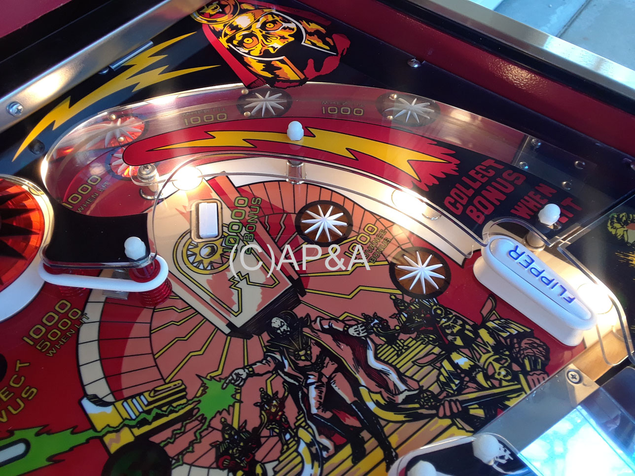 | Upper playfield. Clear custom Mylar pieces have been added in the upper shooter lane to help protect the playfield finish.