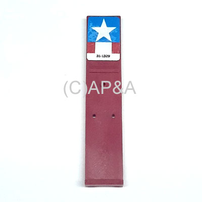 Light red plastic drop target with wide top and red/white/blue star decal for Williams Space Shuttle pinball. Wide top designed to allow balls to roll over when in the down position. T-shaped bottom end.