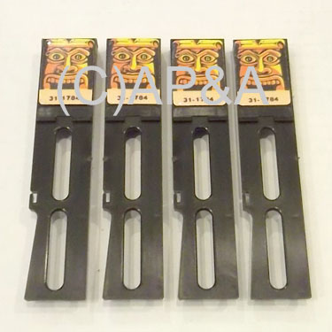 4-piece set of new black plastic drop targets with decals for Williams Indiana Jones pinball. 3 targets for the center 3-bank and 1 for the single drop target unit in front of the captive ball in upper right corner of playfield.
