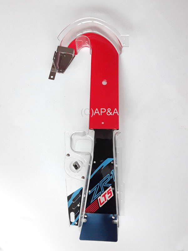 Left ramp that goes into the LT-5 engine mechanism on Bally Corvette pinball. New aftermarket reproduction with thicker plastic than factory original. Comes with decals already installed and the following parts already attached with factory-style rivets: metal ramp entrance flap, flasher lamp socket, and exit gate bracket.