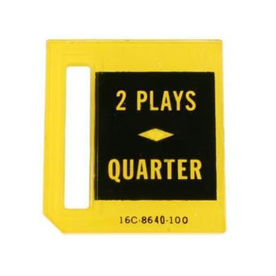 Plastic price plate for coin slot entry on older Williams pinball and arcade games from mid 1960s through early 1980s. Measures 1-11/16 inches wide, 1-7/8 inches tall, 1/8 inch thick.