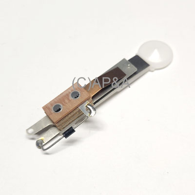 Pop bumper leaf switch assembly including diode and plastic spoon actuator for some Data East, Sega, and late-model Stern Pinball games.