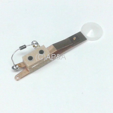 Pop bumper leaf switch assembly including diode and plastic spoon actuator for some Data East, Sega, and late-model Stern Pinball games.