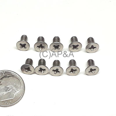 Set of 10 screws. Phillips flat head screw, #6 diameter, 32 thread pitch, 1/4 inch length, 82-degree undercut for thin materials. 18-8 stainless steel, passivated.