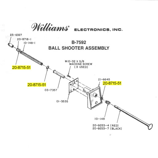 For all makes and models that use a standard manual ball shooter assembly with 3/8-inch diameter ball shooter. Replaces Bally # P-2879 (old-style brass cup), Williams # 20-8715-51, Bally/Williams # 4700-00051-00, and others.