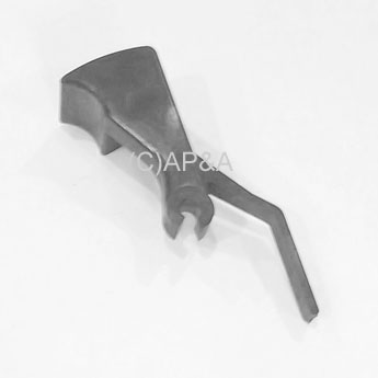 This armature clips on to an existing pivot pin on the inside surface of the metal coin door panel. The orange coin reject button, when pushed, presses against the thick end of this armature. The armature then pivots and presses on the reject tab on the coin mechanism to reject any jammed coins.