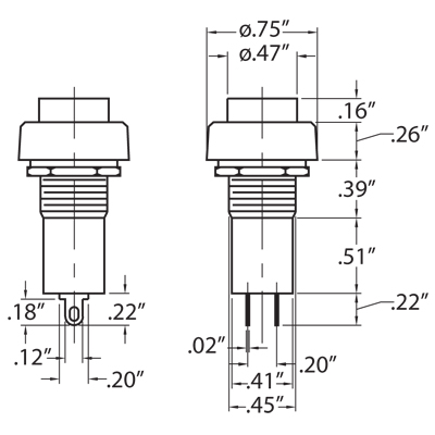 Rated 3A at 125vac, 1.5A at 250vac. Bezel measures 3/4 inch diameter (widest point). Threaded portion measures approx. 3/18 inch, 7/16 inch diameter (requires 7/16 or 1/2 inch diameter mounting hole). Overall height approx. 1-1/2 inch.