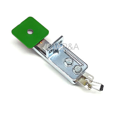 Green stationary standup target switch assembly, square. Target face measures 1 inch. Includes diode on solder lugs and stabilizing mounting bracket.
