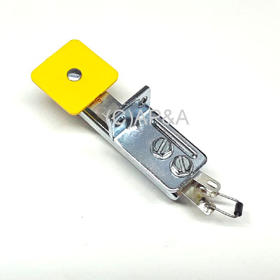 Yellow stationary standup target switch assembly, square. Target face measures 1 inch. Includes diode on solder lugs and stabilizing mounting bracket.