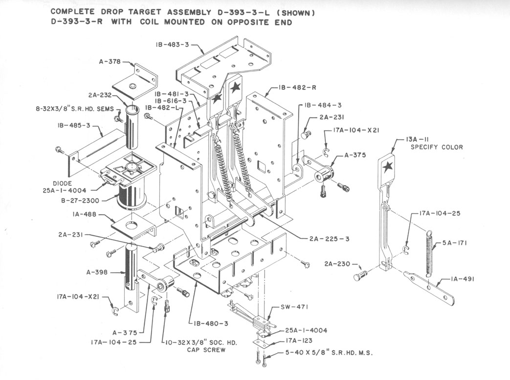 IMPORTANT NOTE: Some vintage Stern games may use a shorter spring that measures approx. 9/16-inch long (center coiled section). The long one (this one) mounts between the drop target and the metal reset link arm at the bottom of the drop target (see illustration below). If your game uses a short spring that mounts between the drop target and a spring bracket bar that mounts halfway up in the drop target assembly, then you can use Bally part # SP-100-314-S instead.