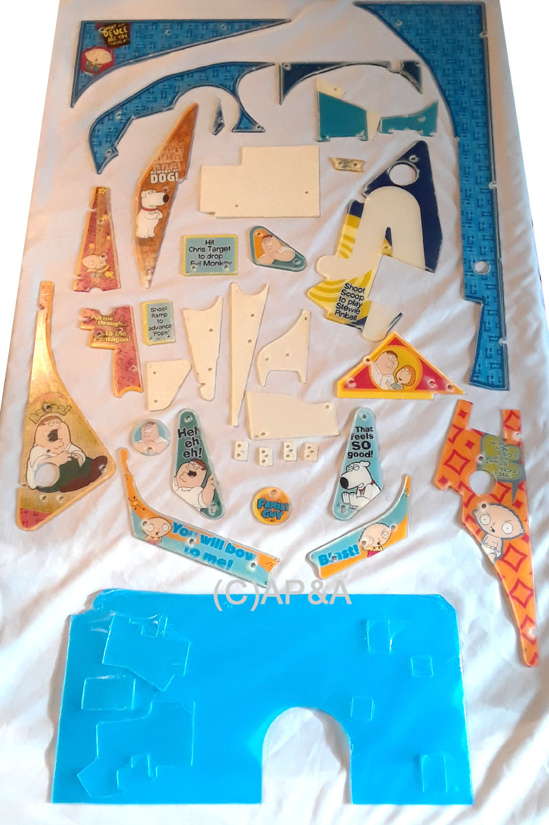 35-piece set of factory-original NOS (new old stock) playfield artwork and clear flat plastics for Stern Family Guy pinball. All pieces include removable protective film to help prevent scuffs/scratches.