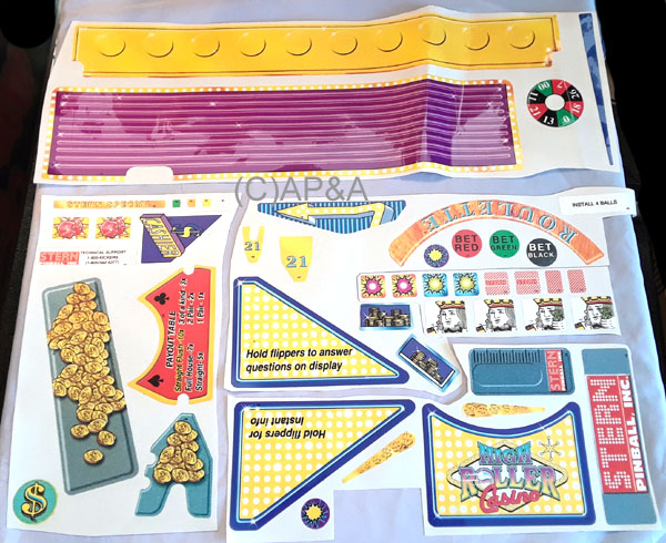 46-piece factory-original NOS (new old stock) playfield and cabinet interior decal set for Stern High Roller Casino pinball.