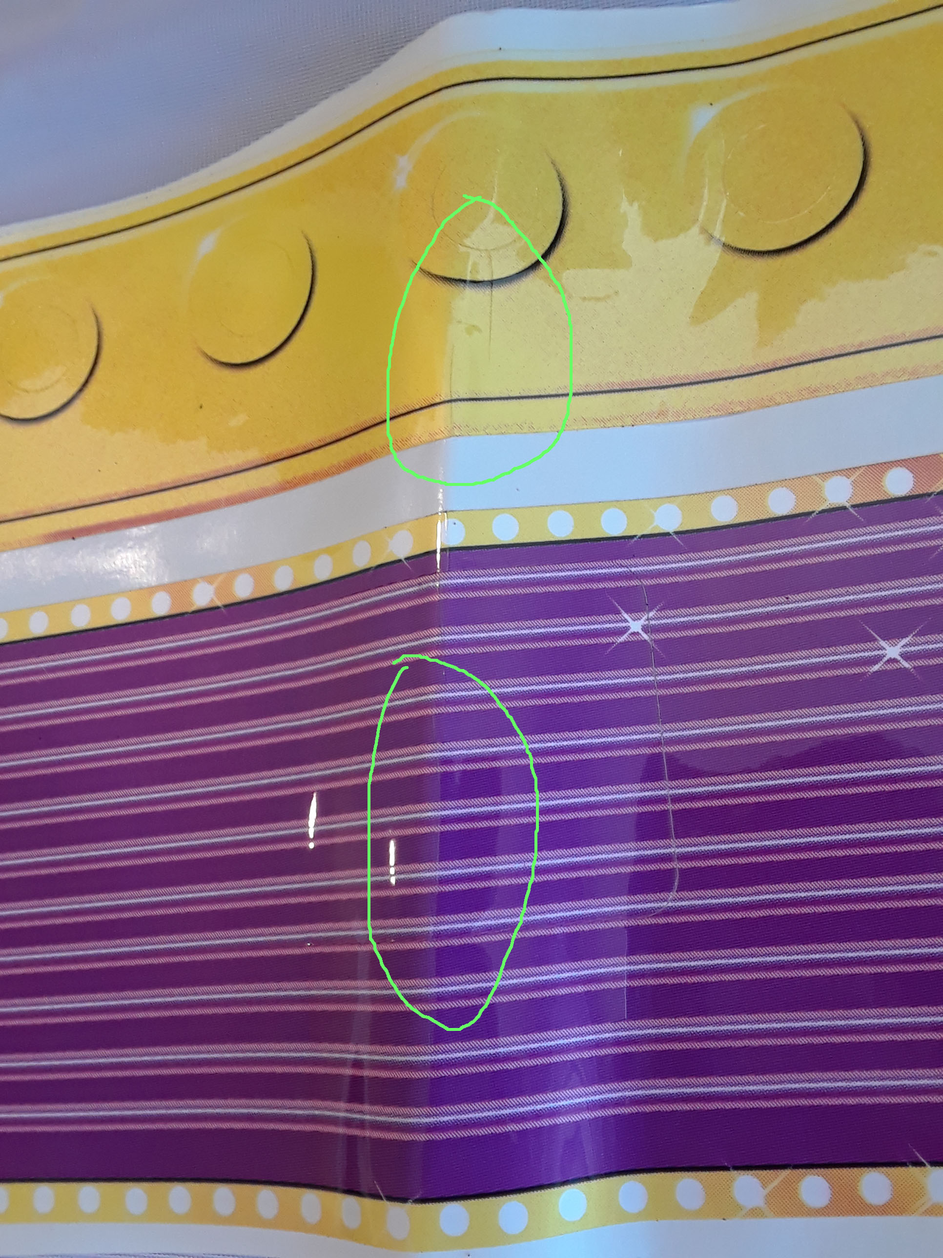 NOTE: The large/wide gold and purple back panel decals (top of image) were folded/creased at the factory before shipping, so both have small cracks along the fold (see additional image below for detail). Based on where these decals are located on the game, these blemishes will likely not be noticeable after installation. Mentioned here for clarity.
