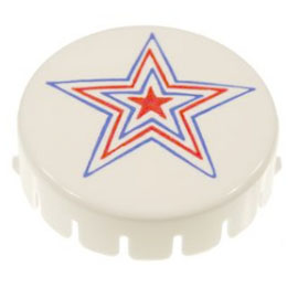 Pop bumper cap used on early and late-model Gottlieb and Gottlieb / Premier games. This cap features blue and red star designs (outside star is blue) printed on white plastic cap.