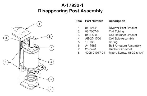 Up-post/disappearing post assembly for top loop on Williams Congo pinball.