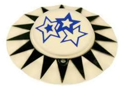 White pop bumper cap with black starburst design around the edge and 3 stars logo in center in blue printing, hot-stamped. For left pop bumper on Dolly Parton pinball.