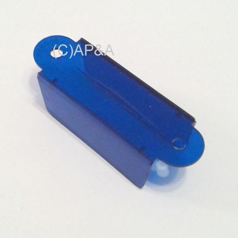 Blue transparent plastic lane guide, 2-sided. 2-3/4-inch overall length, 7/8-inch width, 2-1/8-inch spacing between screw holes, center-to-center. Can be used on most makes and models that use this size guide.