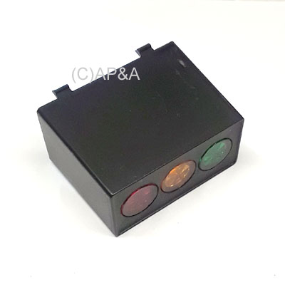 Black plastic traffic light housing sub-assembly with red, yellow, and green lamp lenses.