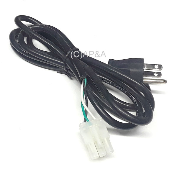 6 foot long video monitor power cord, black, with grounded 3-prong plug end (wall plug), and 3-position connector on other end (monitor end).
