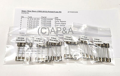 Fuse assortment kit with 4 each of the common fuses for most Sega and modern Stern Pinball games made from 1995 to 2012 (see game listing below).