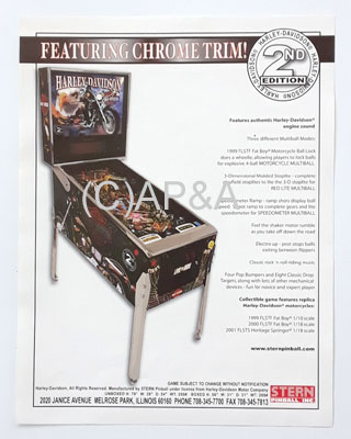 Factory-original color sales/promotional flyer for Stern Harley Davidson pinball (2nd edition). 1-sided, new condition. Limited number available. This is the 2nd edition flyer (2002 Stern).