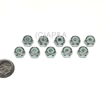 Set of 10 nuts. #8-32 nylock nut with nylon insert. 15/64-inch tall, 11/32-inch width. Steel with zinc finish.