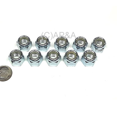 Set of 10 nuts. 3/8-16 nylock nut. 3/8-inch inner diameter, 16-thread pitch (threads per inch), 19/64 inches tall. Steel with zinc finish.