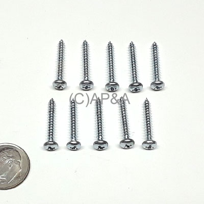 Set of 10 #4 diameter screws, 7/8-inch length. Phillips pan head, steel, zinc plated.