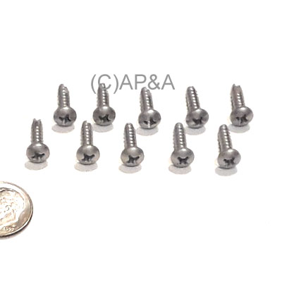 Set of 10 screws. Phillips pan head screw, #6 diameter, 1/2-inch length. Thread-cutting, Type 25 / Type BT, 410 stainless steel, zinc plated.