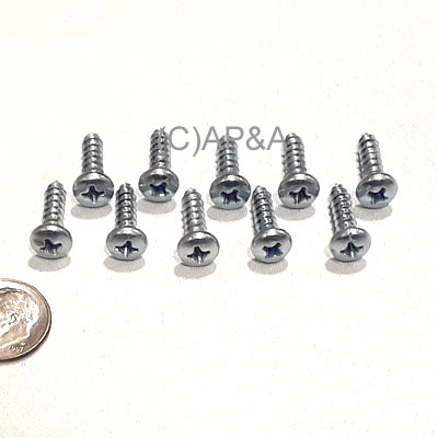 Set of 10 screws. Phillips round head screw (PRH), #8 diameter, 5/8-inch length. Zinc plated steel. Coarse thread for wood, sheet-metal, or plastic.