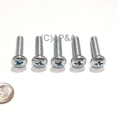 Set of 5 screws. 1/4 inch diameter, 20 thread pitch, 1 inch length. Phillips pan head (PPH), machine screw (MS). Steel, zinc plated.