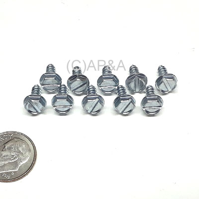 Set of 10 screws. Hex washer head screw, #6 diameter, 3/8-inch length, wood/sheet-metal (coarse) thread. Slotted head. Steel, zinc plated.