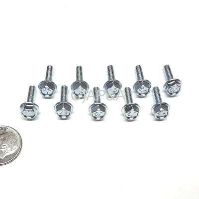 Set of 10 screws. #6 diameter, 32 thread pitch, 1/2-inch long. Hex washer head (HWH) with machine thread (MS). Swage/serrated underside of head to help prevent loosening. Steel, zinc plated.