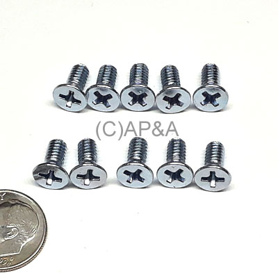 Set of 10 screws. Flat head Phillips screw, standard countersunk (angled) head, #8 diameter, 32 threads per inch, 3/8 length. Zinc plated.