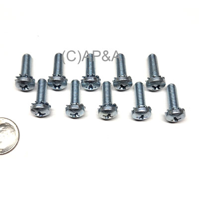 Set of 10 screws. #10 diameter, 32 threads per inch, 5/8 inch length. Phillips pan-head (PPH) machine-thread (MS) screw with built in star washer (SEMS).