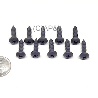 Set of 10 screws. #8 diameter, 5/8 inch length, Philips round head (PRH) screw, wood or sheet-metal thread (SMS). Black oxide finish.
