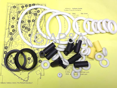 This 44-piece kit includes:- All playfield top-side rubber parts that come in contact with the ball (unless otherwise noted - see note below).