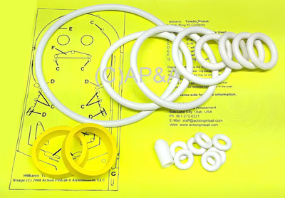 This 18-piece kit includes:- All playfield top-side rubber parts that come in contact with the ball (unless otherwise noted - see note below).