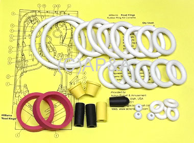Our rubber kits include (where applicable or otherwise noted) most or all ball-contact rubber parts on the top side of the playfield, including regular round rings, post bumpers, sleeve bumpers, mini post rings, flipper rings, ball shooter tip, and top arch rebound bumper. Rings for mini-posts on tops of plastics and ramps are also included for games that use them.