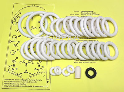 This 34-piece kit includes:- All playfield top-side rubber parts that come in contact with the ball (unless otherwise noted - see note below).